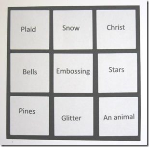 Create a Christmas card using the tic-tac-toe board below. Use all three items in any row: across, down, or diagonally. You may add additional items to your card if you like, but you must include the 3 in the row you have chosen.